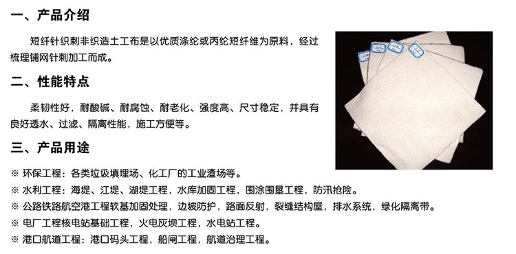 5、短纖土工布產品不含化學添加劑,也不經熱處理,是環保型的建筑材料。